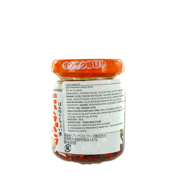 Ingredienti: pepe rosso, olio di mais, aglio fritto, olio di sesamo, zucchero, cipolla in polvere, sale e, salsa di soia in polvere, grasso (olio di colza, olio di palma, olio di palma crudo), mandorle, salsa di soia in polvere, salsa piccante (pepe rosso, sale, riso), sale, cipolla fritta, sesamo, glutammato monosodico, vitamina E. Contiene grano, sesamo, soia. Valore nutrizionale per 100g: valore energetico per 2314KJ (553kcal), lipidi 41.1 g, di cui acidi grassi saturi 6g, carboidrati 34.8, di cui zucchero 8g, proteine 11g, sale 6.4 g. Importato da Thanh Binh Young